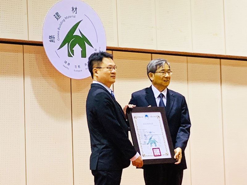 2020年於內政部建築研究所指導,國立成功大學主辦之「綠建材標章制度講習會」,獲頒綠建材標章證書。並由王榮進所長親自頒發。本公司馬弘祥總經理獲邀親自出席領取證書及合影留念。